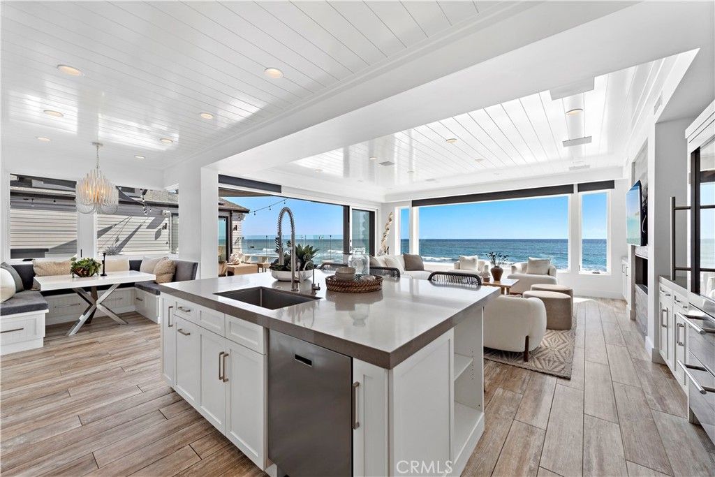 Set on the sand in the exclusive Capistrano Shores community, this rare double homesite offers ultimate California beachfront living, with panoramic whitewater, sunset, coastline, and beach views that stretch from the San Clemente Pier through the Headlands of Dana Point. Contemporary and highly upgraded, the main home provides four bedroom, four bathrooms, and the second home provides three bedrooms, 2 bathrooms. Lush outdoor space is equipped with security doors, tons of seating, a built-in BBQ and bar area, a storage area for all your beach accessories, and a partial glass enclosure for protection from the natural elements. The chic kitchen includes an oversized island, a large breakfast nook, a wet bar, and a full-size wine cooler with ample pantry storage space open to the well-appointed living room with a fireplace and security shutters to form a spectacular great room. Ocean views beyond comparison are throughout the open concept floor plan created by high ceilings, massive seamless windows, and stackable glass doors that lead to a spacious private courtyard. A laundry room, a bonus room, a three-quarter bath, a bedroom, and a powder room, both offering outdoor access, complete the bright and airy main level. The second level offers a large skylight, revealing a primary suite with panoramic ocean views, a windowed spa-like bathroom, a walk-in closet, and a deck with coastline views. Two additional bedrooms, a bathroom, a playroom equipped with a media stage, and built-in toy bins complete the second level. Additional highlights include porcelain tile flooring and wainscotting throughout, designer lighting and plumbing fixtures, electric window shades, security shutters, plantation shutters, multiple ceiling fans, A/C, built-in audio, golf cart parking, and four parking spots with an EV charging. Capistrano Shores is well located, with easy access to downtown San Clemente and its robust dining scene. Moments from scenic beach trails and community parks and located within an hour of most Southern California attractions. Experience the bliss of coastal living with this remarkable beachfront trophy property.