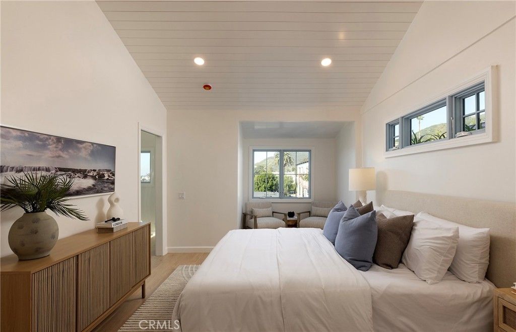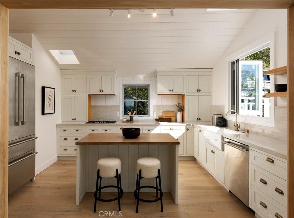 Perched above the shoreline in South Laguna Village, this newly remodeled coastal residence captures sweeping ocean and Catalina Island views, offering a refined yet relaxed expression of Laguna Beach living just moments from iconic Thousand Steps Beach. Spanning approximately 2,055 square feet, the three-bedroom, two-and-one-quarter-bath home has been thoughtfully reimagined to balance modern comfort with timeless coastal character. Natural light welcomes you on the entry level, where a gracious foyer opens to a generous family room enhanced by custom built-ins and an easy indoor-outdoor connection. Two well-appointed secondary bedrooms are located on this level"”one opening directly to the backyard"”along with a combined bath and laundry area designed for both function and flow. Upstairs, the home unfolds into a bright, open living environment defined by vaulted, wood-beamed ceilings and effortless entertaining spaces. The designer kitchen serves as the heart of the home, featuring white inset cabinetry, quartz countertops, a striking bookmatched quartz backsplash, new Thermador appliances, and a center island with bar seating. A pass-through serving window opens to an expansive ocean-view deck"”ideal for al fresco dining, sunset gatherings, and coastal evenings overlooking the Pacific. The kitchen flows seamlessly into the dining area and a fireplace-warmed living room finished with classic Laguna Beach siding, opening to a second balcony that frames coastline views and includes stairs leading down to the side yard. The primary suite is a tranquil retreat, capturing ocean vistas and offering a sitting area, flexible open space ideal for an office or private lounge, and an ensuite bath with marble countertops. Throughout the home, white oak hardwood flooring, custom white oak cabinetry, curated hardware, and designer lighting create a cohesive, understated aesthetic. Additional highlights include a freshly painted exterior, all-new casement windows, shutters, charming wood flower boxes, and a two-car attached garage with a custom mahogany wood door. Tucked away on a quiet cul-de-sac, this South Laguna residence embodies relaxed coastal elegance"”where panoramic views, thoughtful design, and proximity to the beach come together in one of Laguna Beach's most desirable seaside settings.