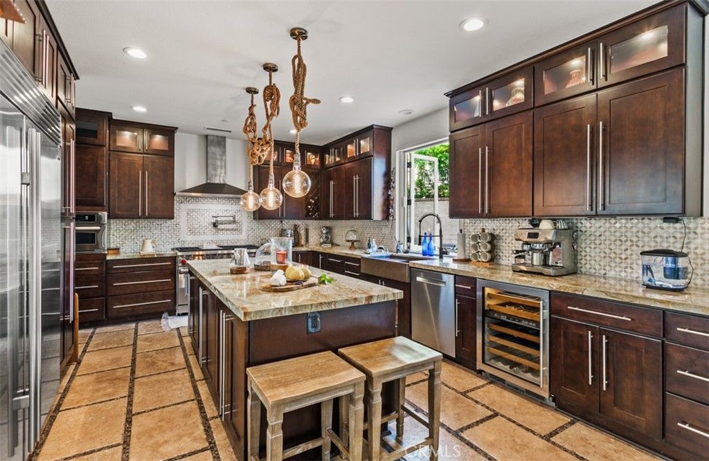 Set on one of the largest parcels within the private gates of Belle Cliff, this residence combines timeless elegance with everyday comfort and an entertainer's dream design. The floorplan offers 5 spacious bedrooms, including a convenient main-level suite, along with a dedicated office/media room, laundry room, and 3 additional bedrooms plus a luxurious primary retreat upstairs. The interior showcases exquisite finishes such as custom tile, stone, and Hevea wood floors. A chef's kitchen serves as the heart of the home, featuring top-tier appliances including a double-wide Sub-Zero refrigerator/freezer, Sub-Zero wine fridge, Wolf 6-burner range with pot filler, double ovens, and convection oven/microwave. A massive center island with dual-sided storage, a copper farmhouse sink, and generous Quartzite counters make the space ideal for both everyday living and entertaining. French doors throughout invite natural light and refreshing ocean breezes, while central air conditioning ensures comfort on warmer days. The backyard is designed for true resort-style living. A sparkling pool with beach-entry, spa, and custom-tiled deck create a private oasis. This is one of the community's rare homes with such expansive outdoor space, perfect for hosting gatherings or enjoying peaceful relaxation. Additional highlights include a 3-car tandem garage with built-in storage and Tesla charger. Residents also enjoy access to Club Pacifica with resort-inspired amenities including cabanas, pool, spa, fitness center, and lounge areas. Conveniently close to Dana Point Harbor, beaches, shopping, dining, and top-rated schools, this home offers the best of coastal Orange County living.