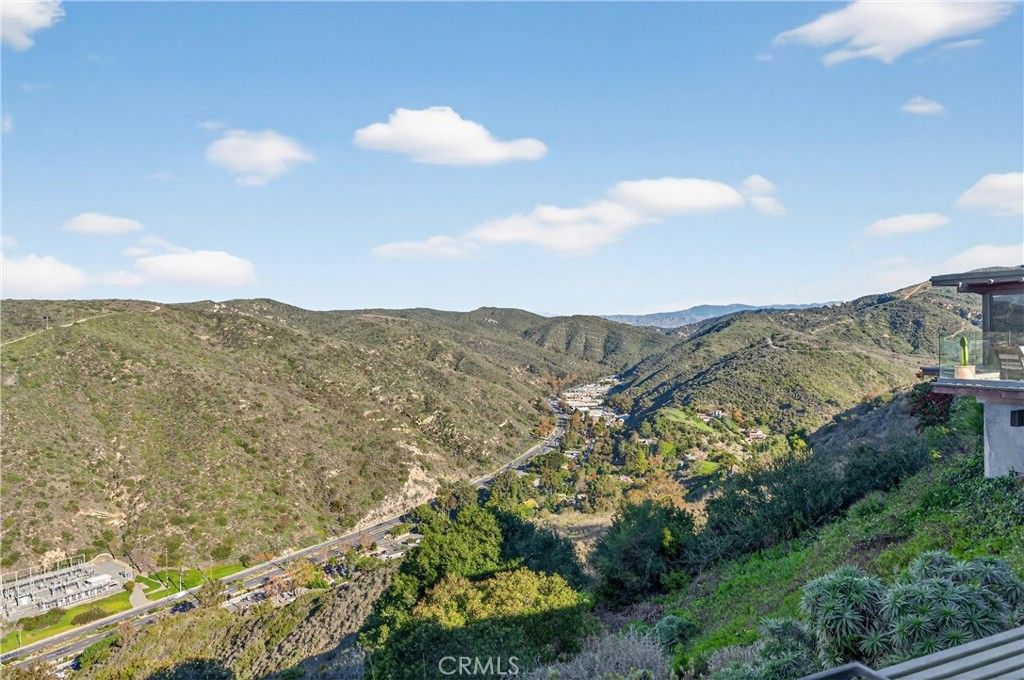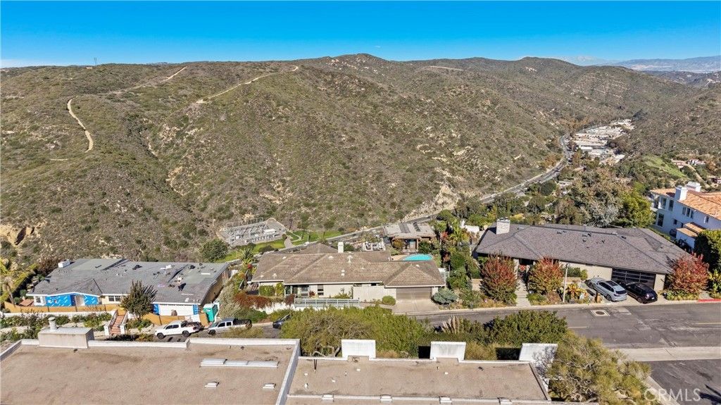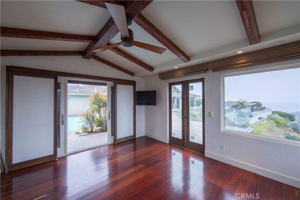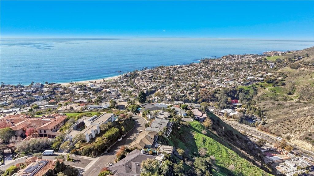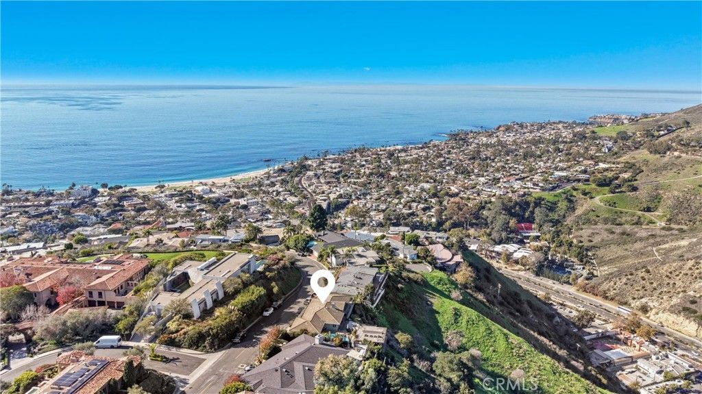 Single Level Ranch home in Prime Laguna Beach. Located in the desirable Mystic Hills, this stunning contemporary residence is situated on an ideal lot with ocean and panoramic canyon views. Only a few minutes from Laguna Main Beach. 3 bed, 2 bath entertainers dream main house with an additional DETACHED 1 bed and 1 bath guest house/casita comes with many architectural designs such as beamed high ceilings, built-in entertainment cabinets, soft LUTRON lighting, hardwood floors, and modern rounded wall edges and colors. Once inside, the spacious living room and dining room opens to a grand deck with a breathtaking panoramic canyon, ocean views and the swimming pool. Indoor outdoor living at it's best as well as a lawn area for the pets. Gourmet kitchen with Subzero and Miele appliances including a wine fridge, Rational German kitchen cabinets and pocket doors from the dining room kitchen separation. Guest house built like a modern retreat with shoji sliding screens with views of the pool, ocean and canyon. It provides a flexible space for possible ADU conversion, a home office, or artist studio, expanding the total living area to approximately 2020 square feet. Main house has hidden TV in cabinet over the fireplace. Garage has a stainless steel door and an electrical outlet for electric car charging. Ample street parking.