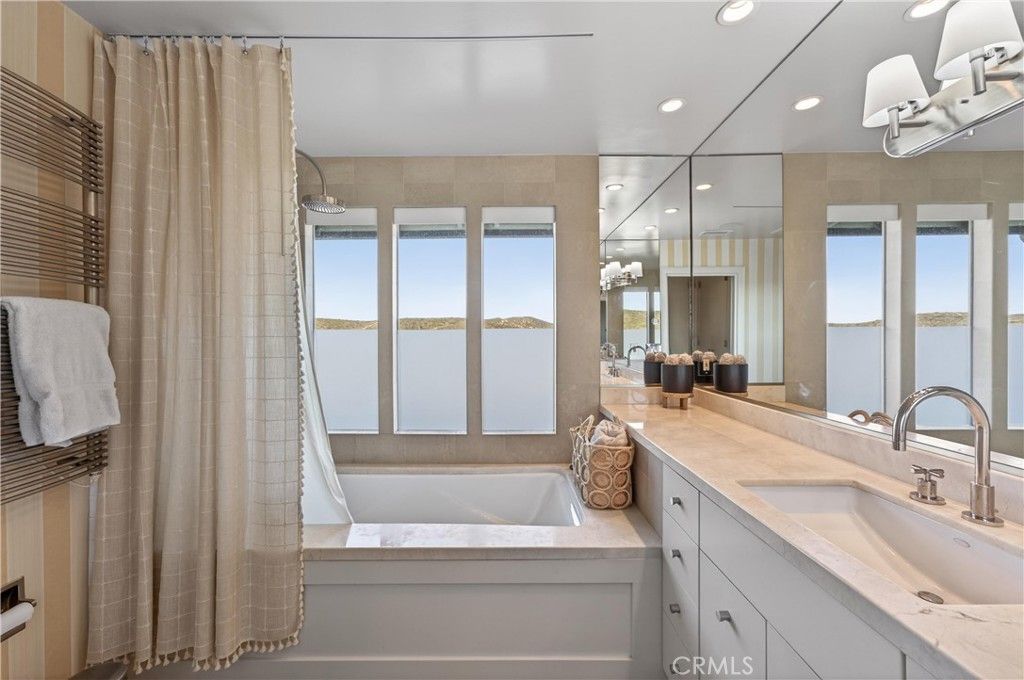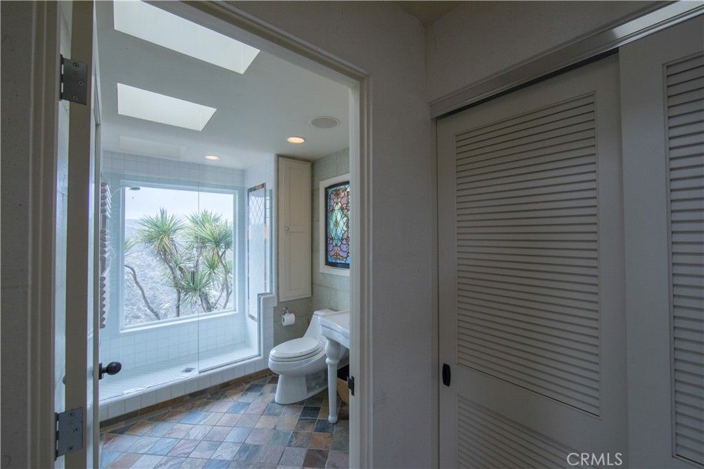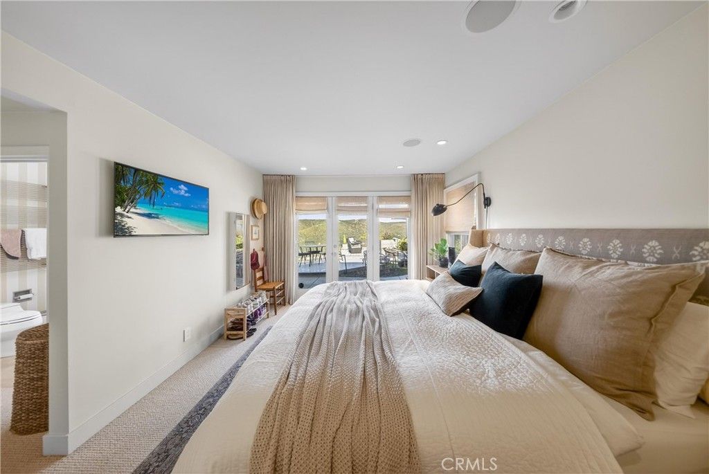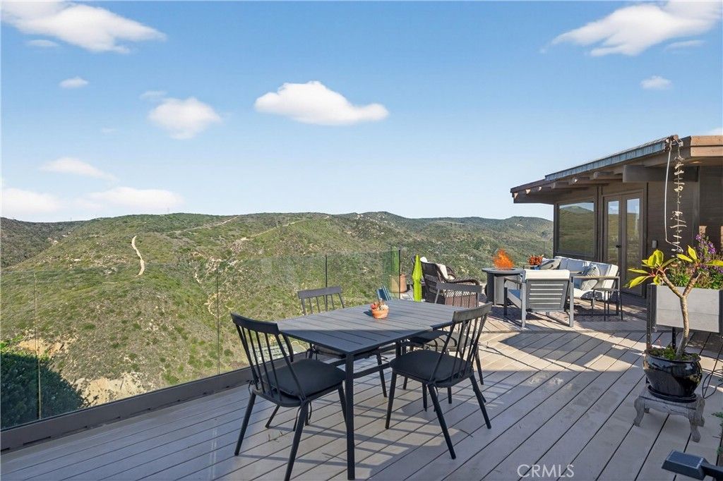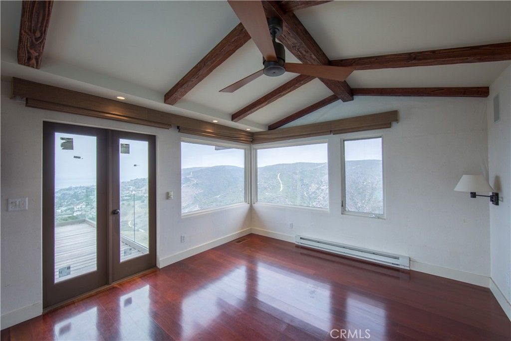 Single Level Ranch home in Prime Laguna Beach. Located in the desirable Mystic Hills, this stunning contemporary residence is situated on an ideal lot with ocean and panoramic canyon views. Only a few minutes from Laguna Main Beach. 3 bed, 2 bath entertainers dream main house with an additional DETACHED 1 bed and 1 bath guest house/casita comes with many architectural designs such as beamed high ceilings, built-in entertainment cabinets, soft LUTRON lighting, hardwood floors, and modern rounded wall edges and colors. Once inside, the spacious living room and dining room opens to a grand deck with a breathtaking panoramic canyon, ocean views and the swimming pool. Indoor outdoor living at it's best as well as a lawn area for the pets. Gourmet kitchen with Subzero and Miele appliances including a wine fridge, Rational German kitchen cabinets and pocket doors from the dining room kitchen separation. Guest house built like a modern retreat with shoji sliding screens with views of the pool, ocean and canyon. It provides a flexible space for possible ADU conversion, a home office, or artist studio, expanding the total living area to approximately 2020 square feet. Main house has hidden TV in cabinet over the fireplace. Garage has a stainless steel door and an electrical outlet for electric car charging. Ample street parking.
